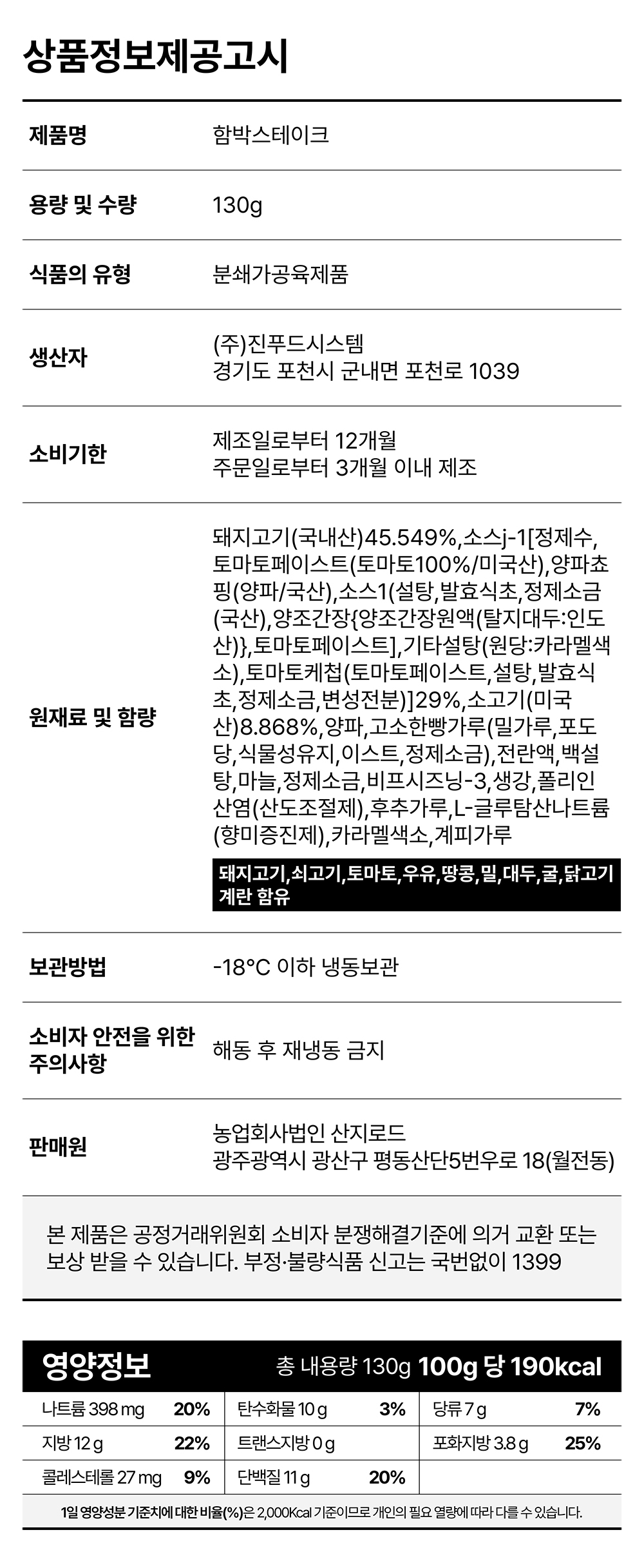 | 1-3. 생산자 및 소재지 (수입품의 경우 생산자, 수입자 및 제조국) | 진푸드시스템 / 경기도 포천시 군내면 포천로 1039 |
